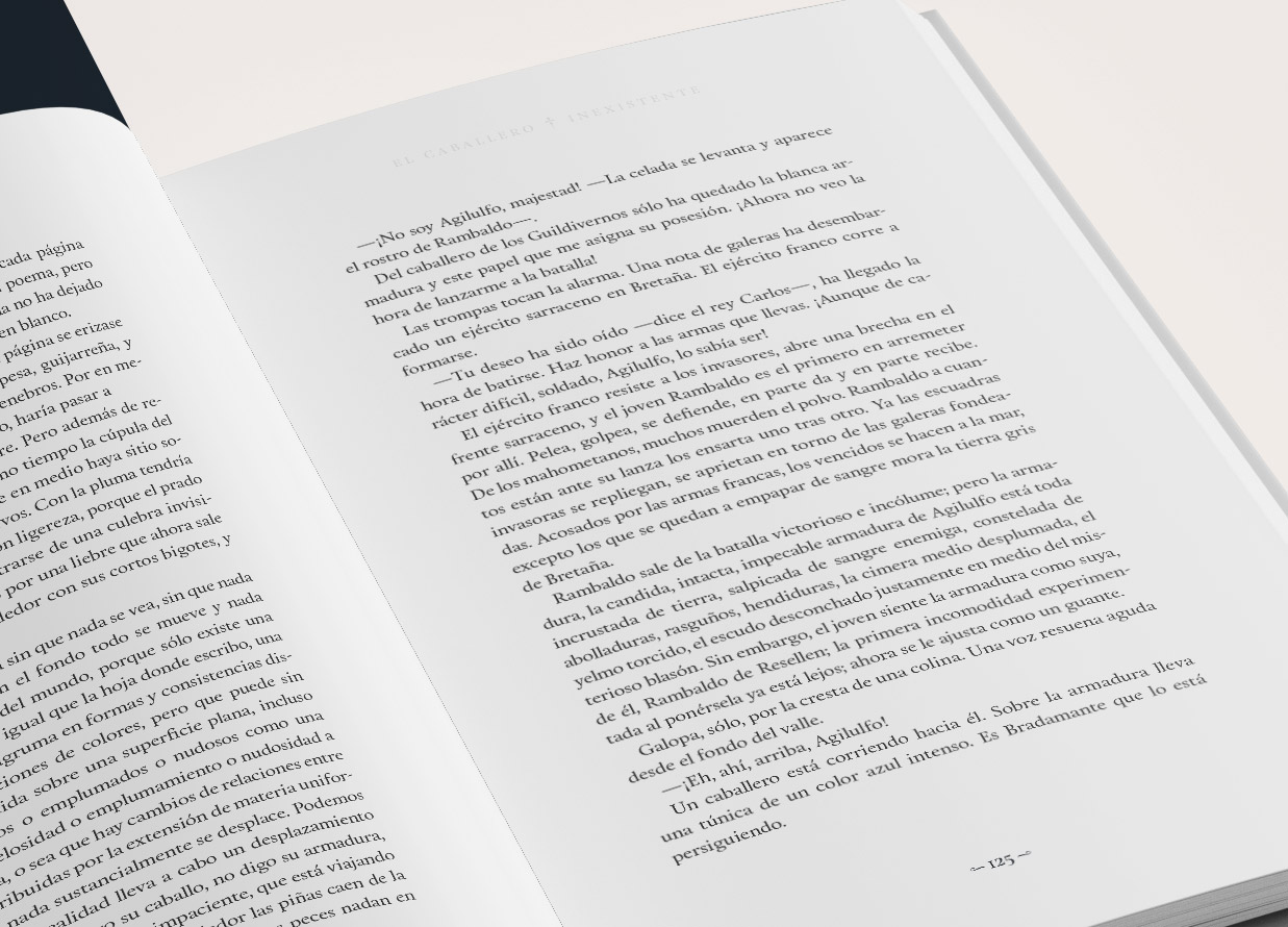 I paid a lot attention to the format, margins and the typographic style and added some ornamental details. In the header, the title of the work disappears little by little as the page is turned, continuing the wordplay of the non-existent knight.